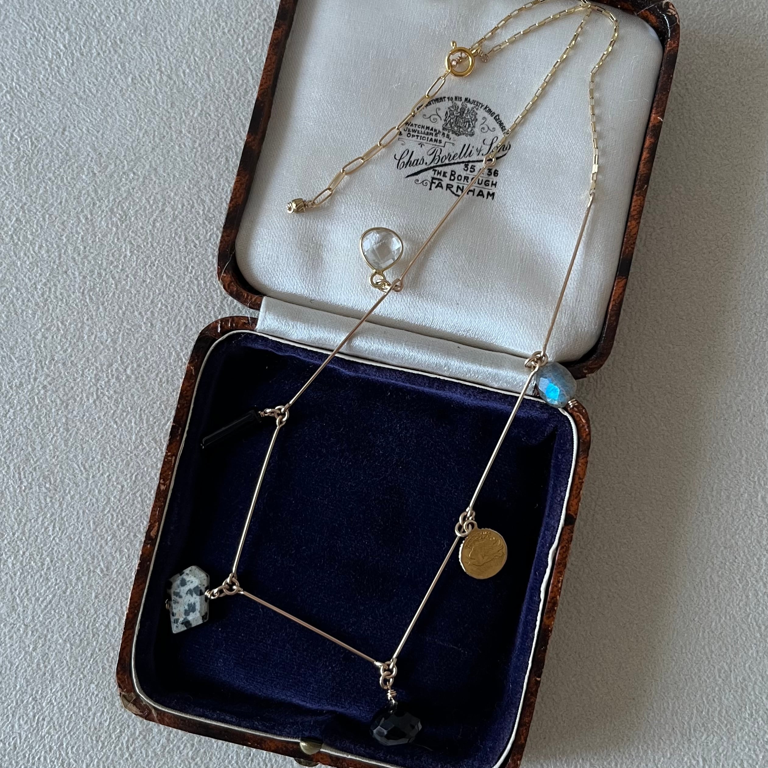 素材: K14GF・スモーキークォーツ・ラブラドライト・ダルメシアンジャスパー・オニキス・真鍮