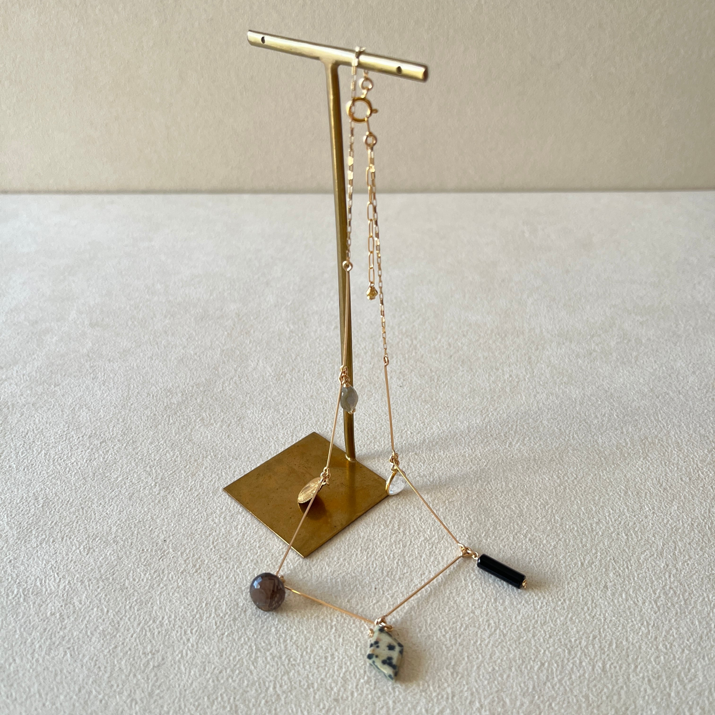 バータイプのチェーンにスモーキークォーツやラブラドライト、ジャスパーなどの天然石をチャームにしたボリュームのあるネックレス。