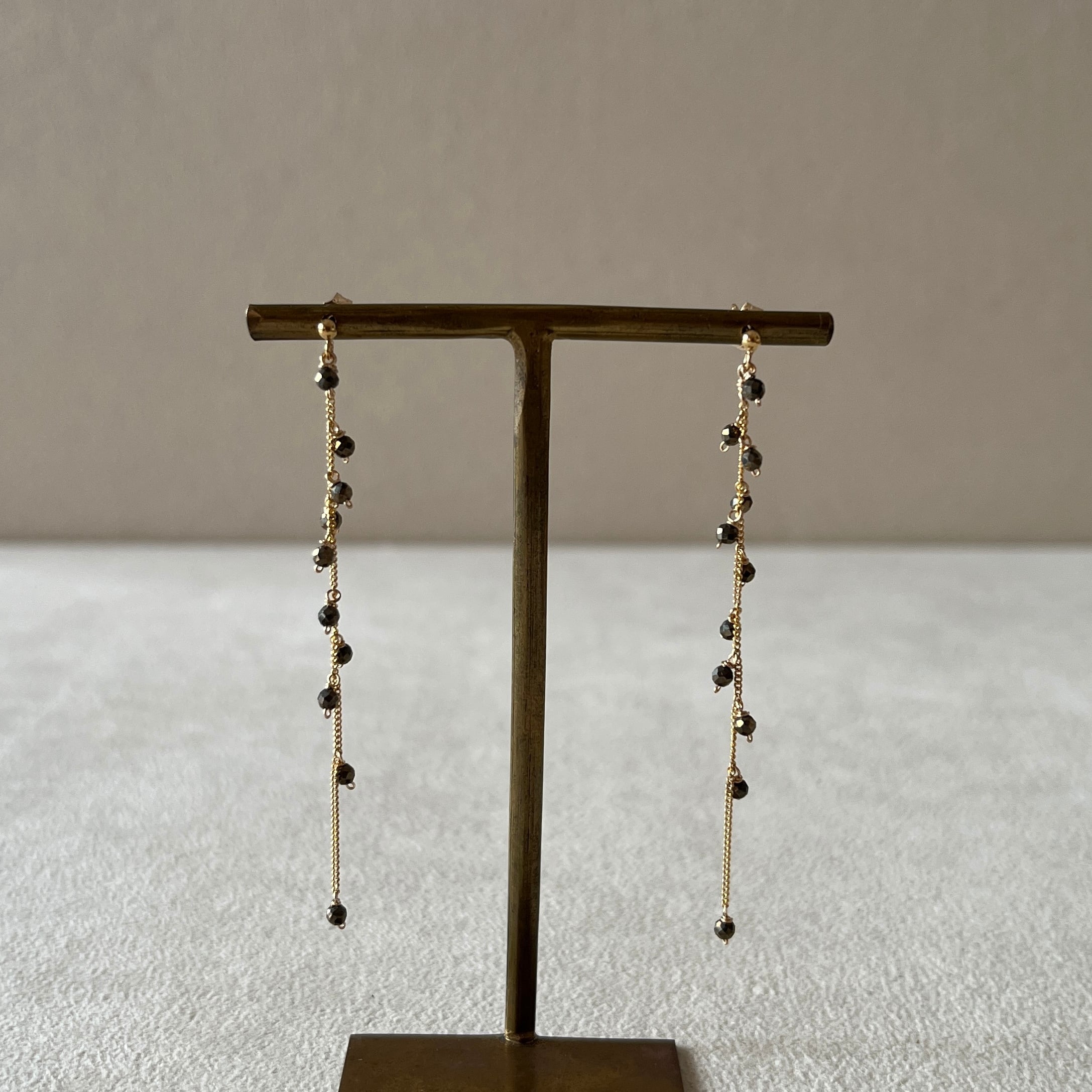 つぶつぶのパイライトがキラキラと輝き、揺れるたびに耳元で華やかなアクセントを加えます。
