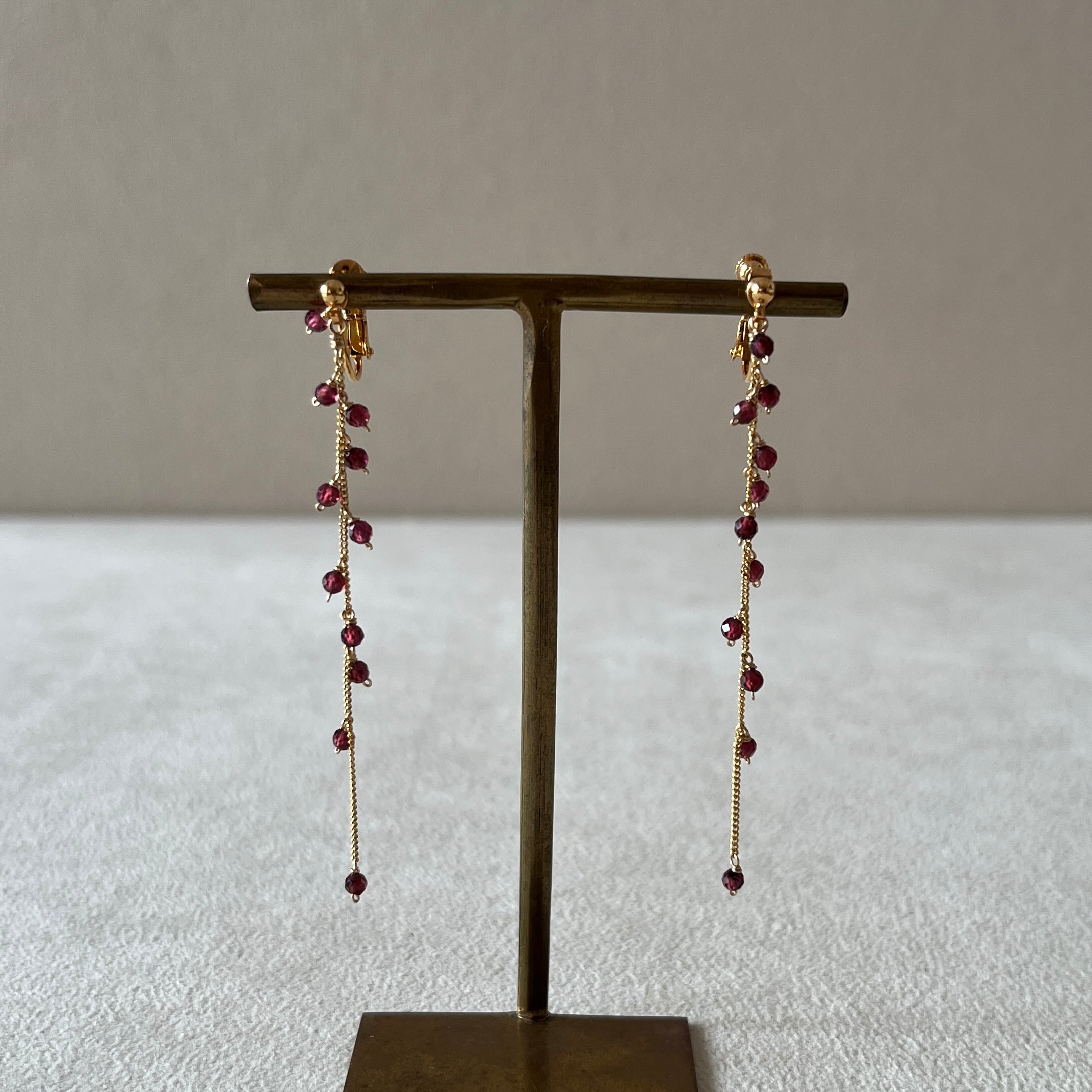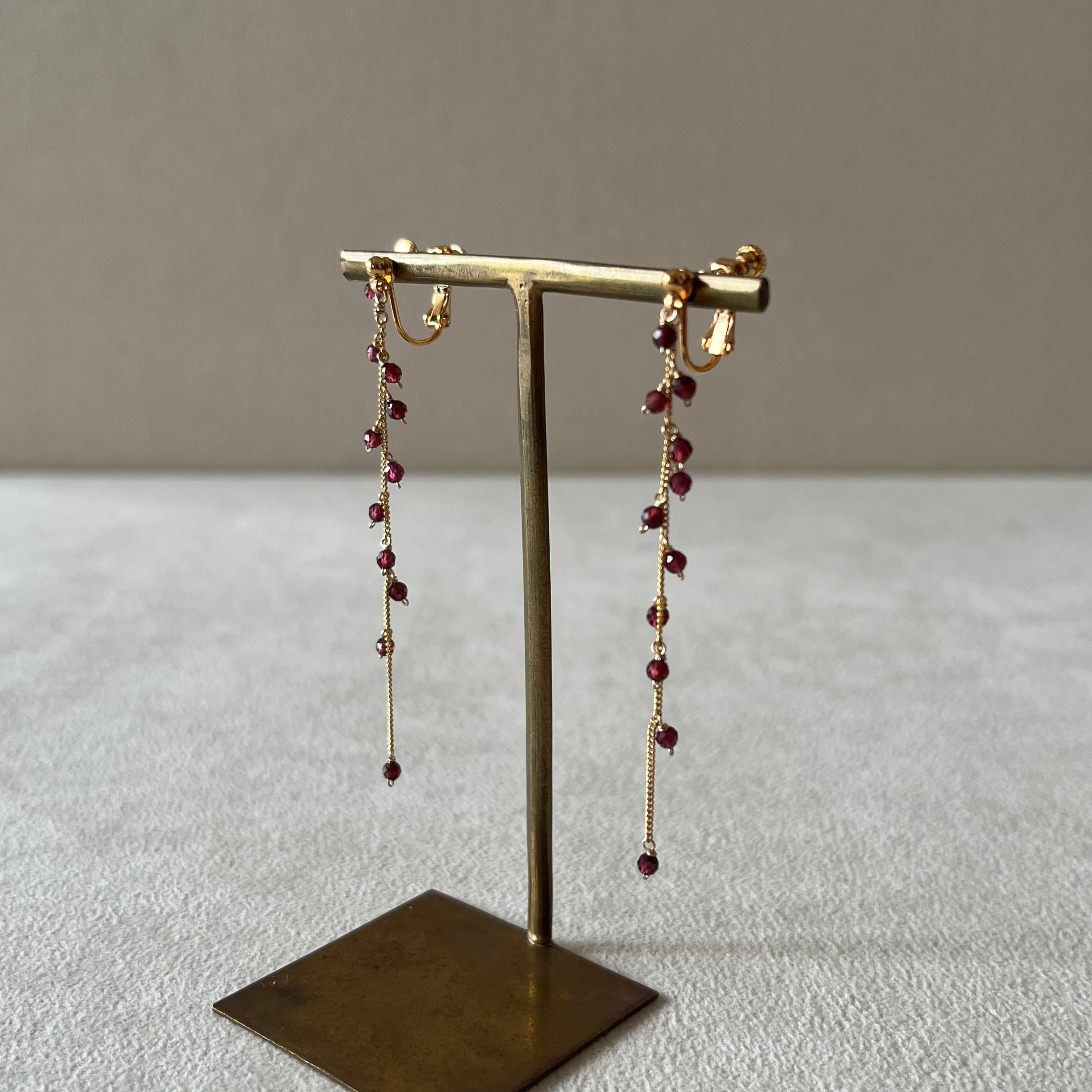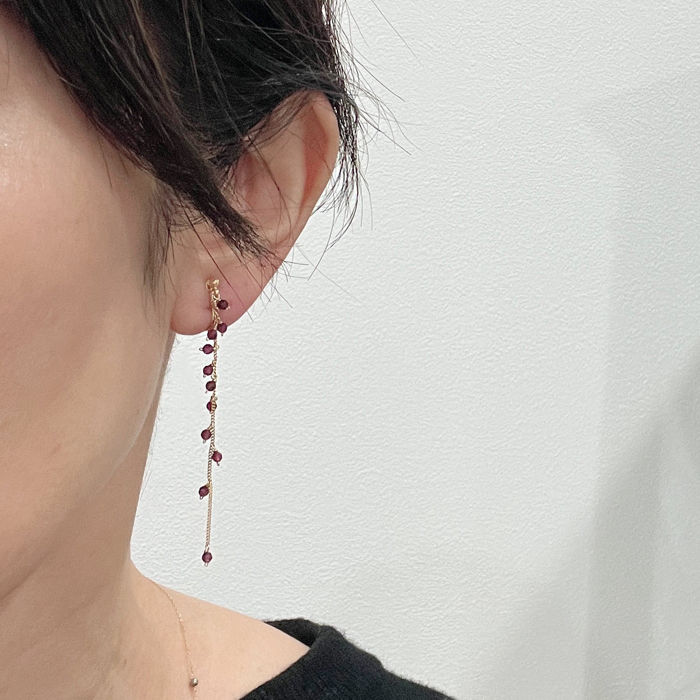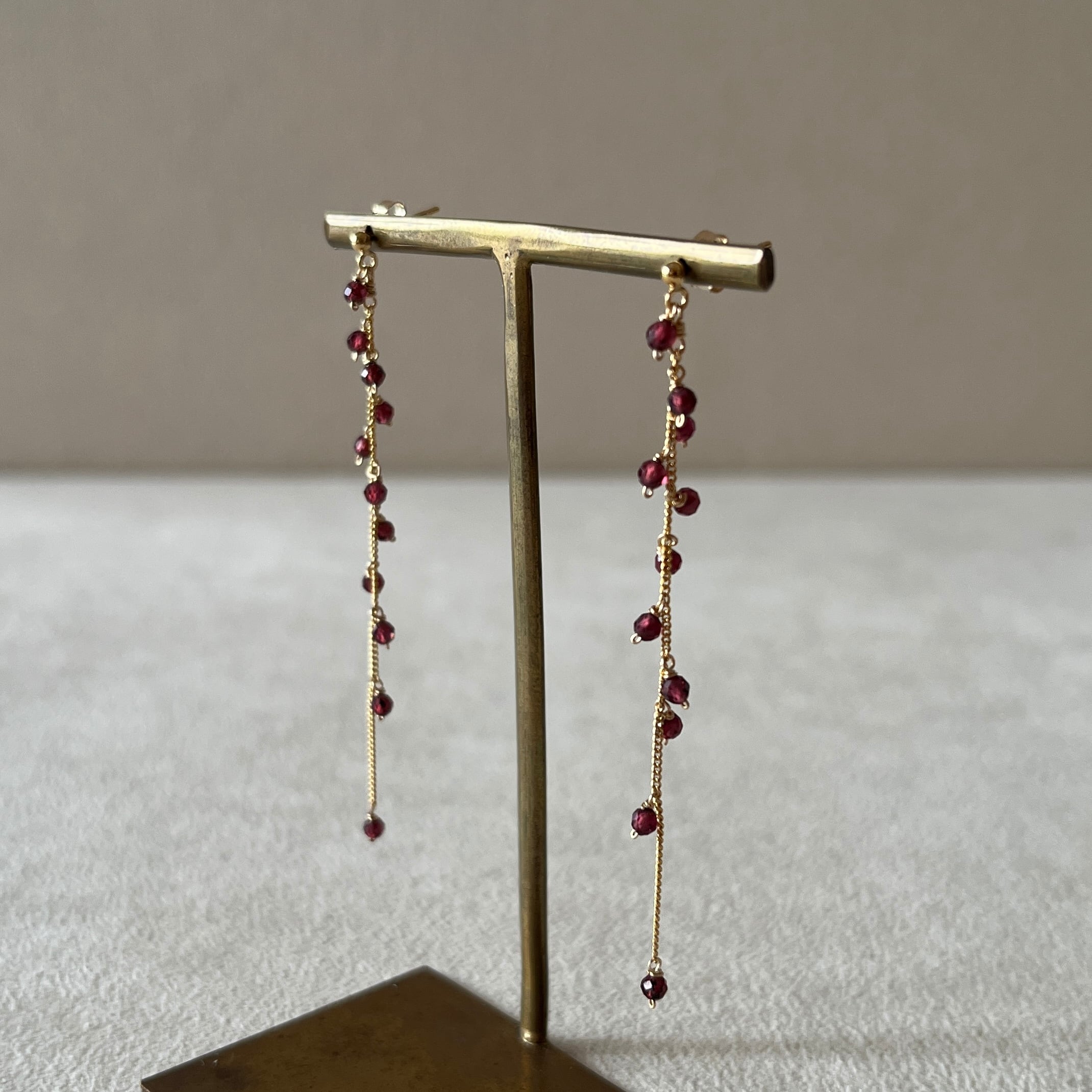 つぶつぶのガーネットがキラキラと輝き、揺れるたびに耳元で華やかなアクセントを加えます。