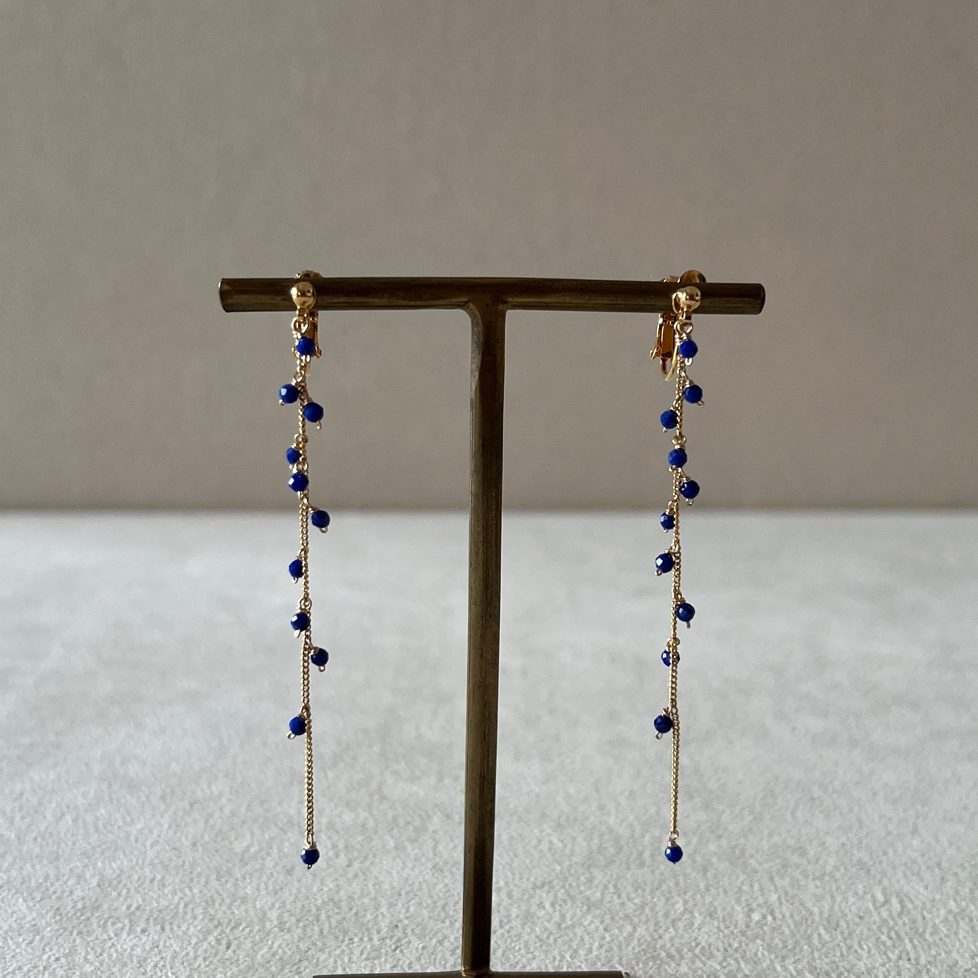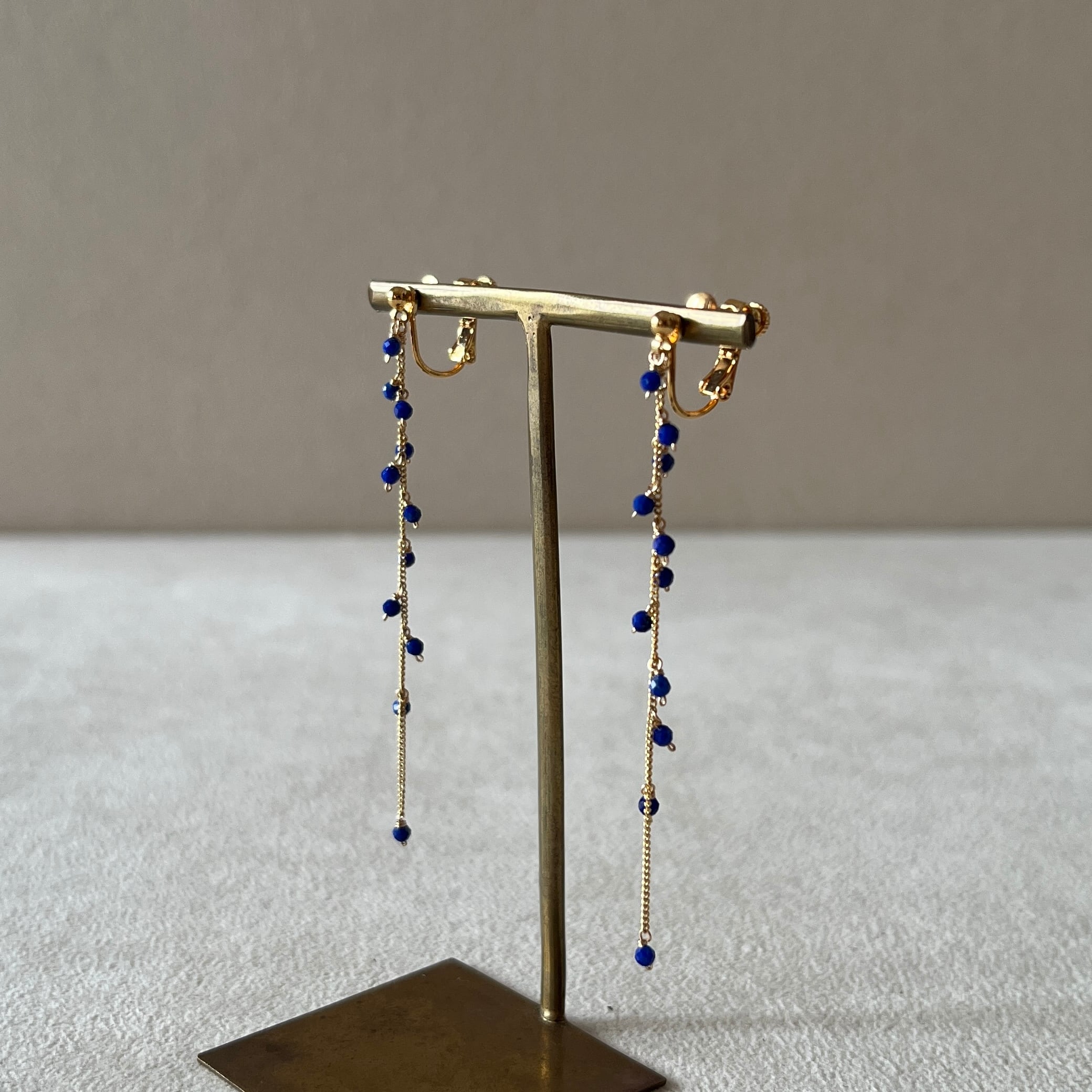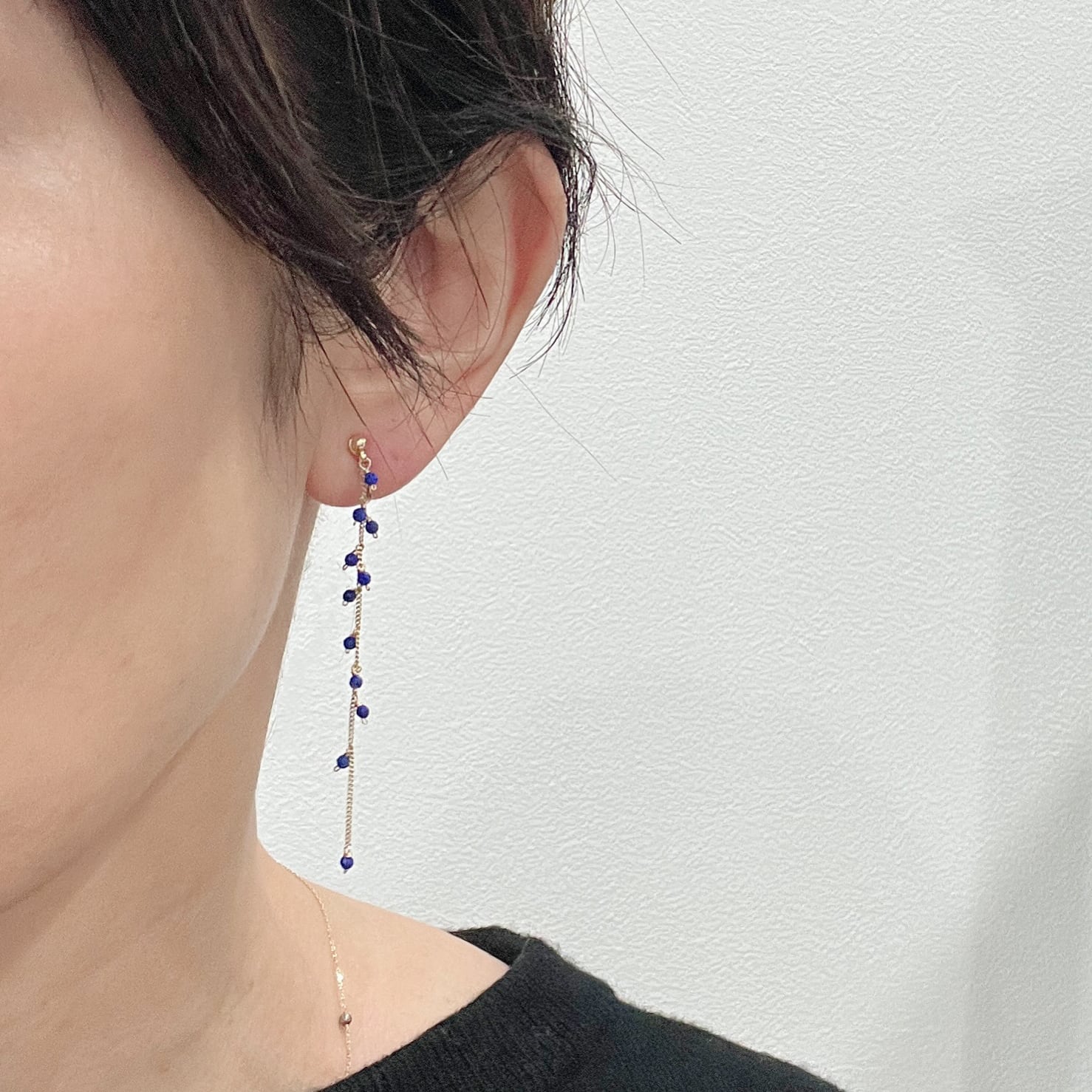 つぶつぶのラピスラズリがキラキラと輝き、揺れるたびに耳元で華やかなアクセントを加えます。