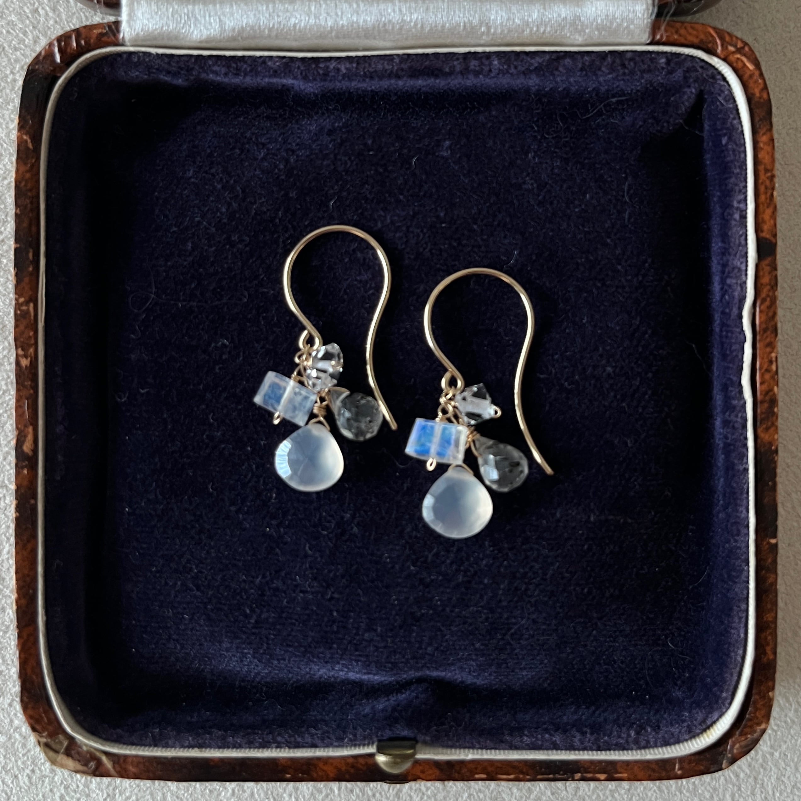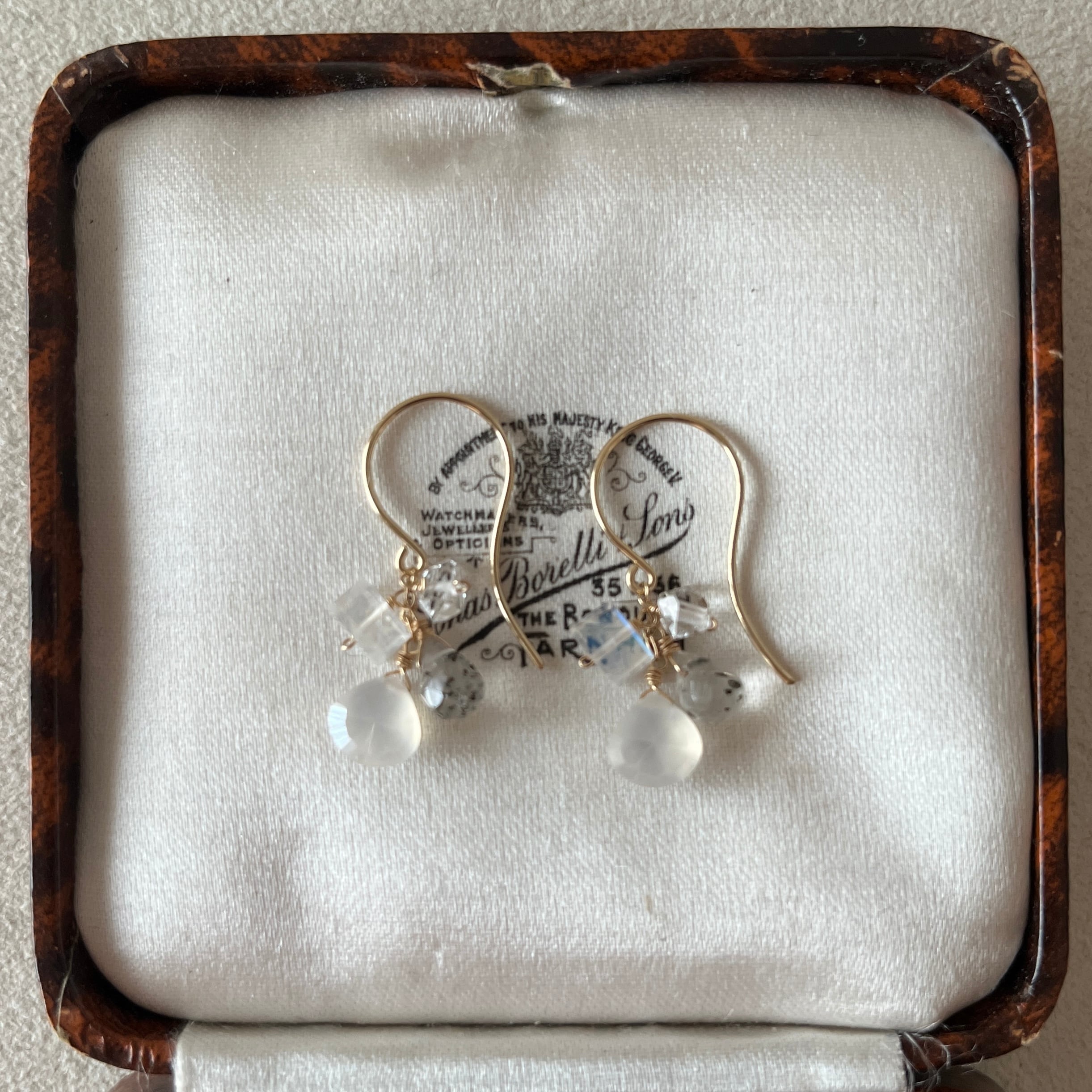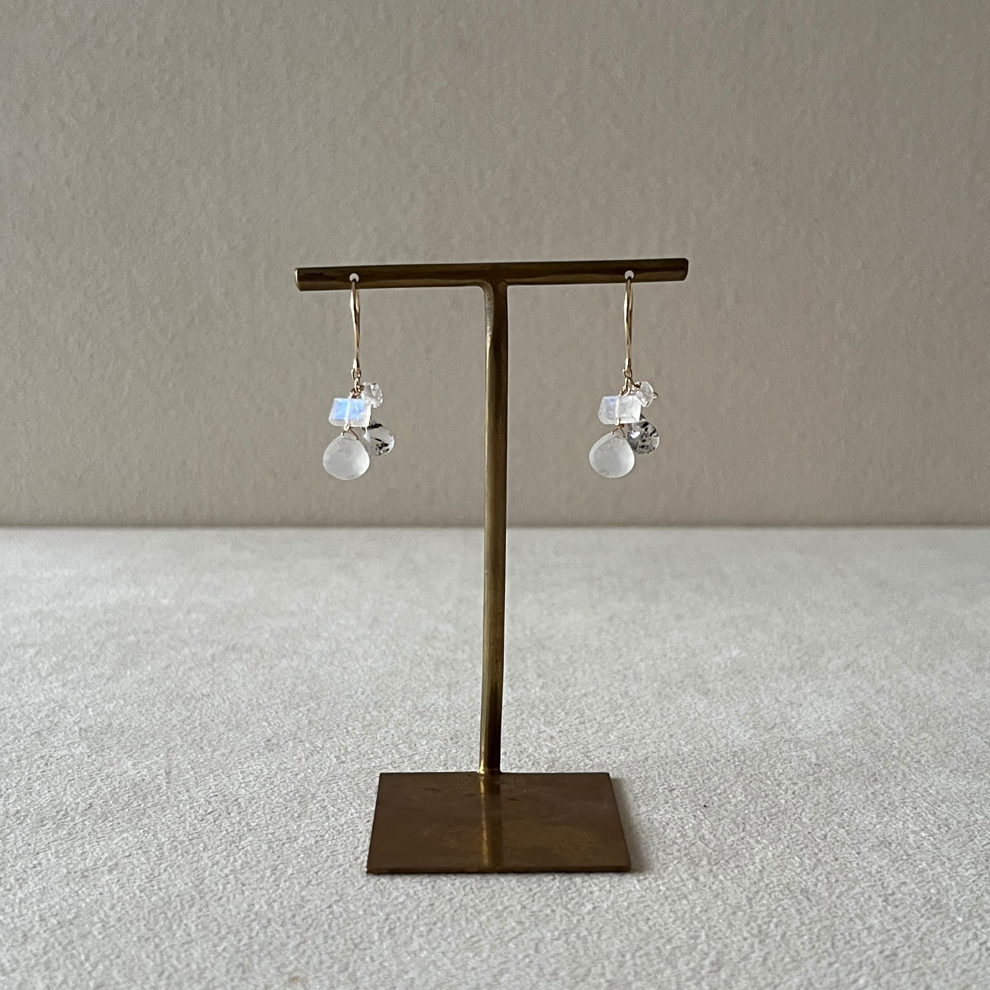 ミルキーホワイトのカルセドニーとブルームーンストーン、さらにクォーツと様々な天然石が組み合わさり、小さいながらも存在感のあるデザインに仕上げました。