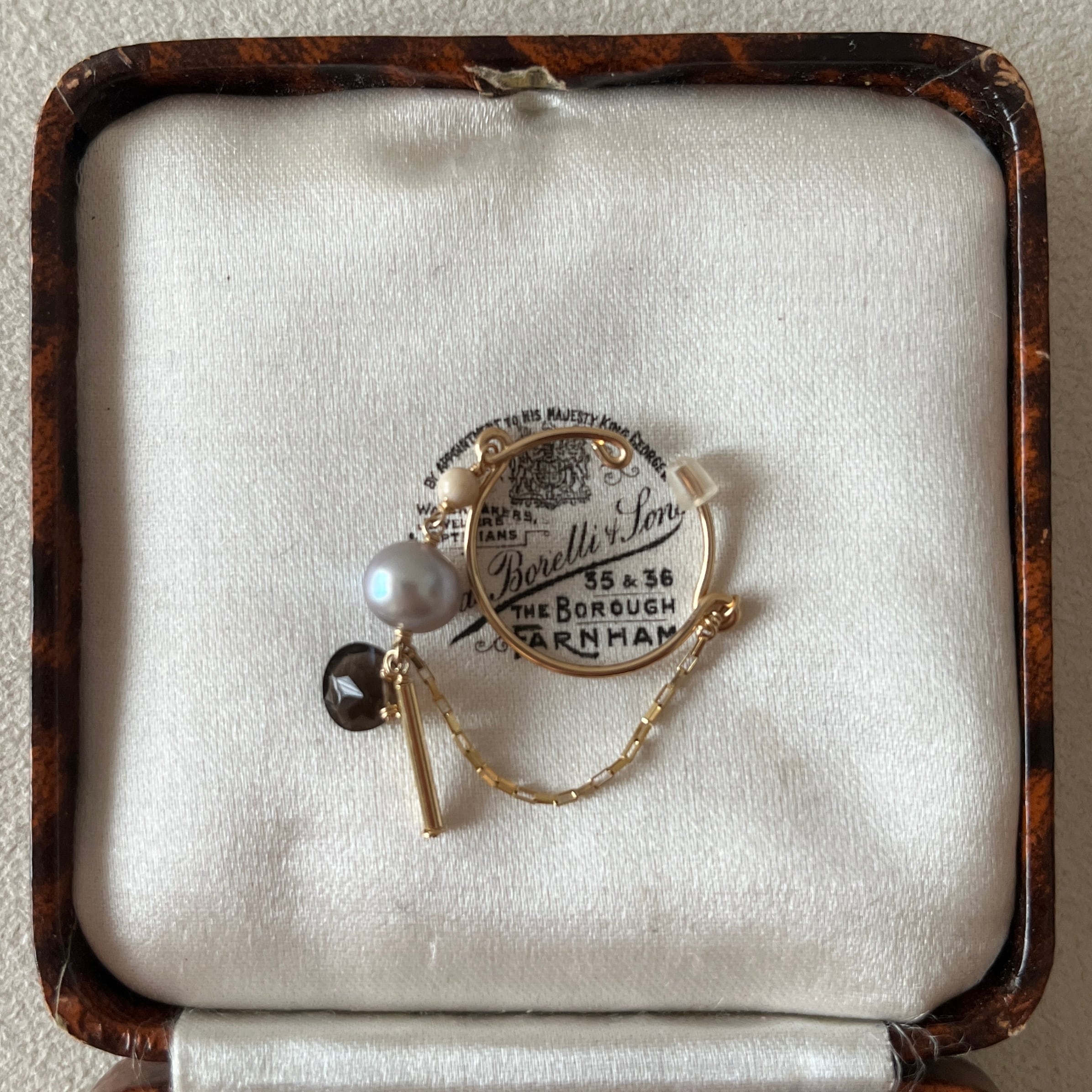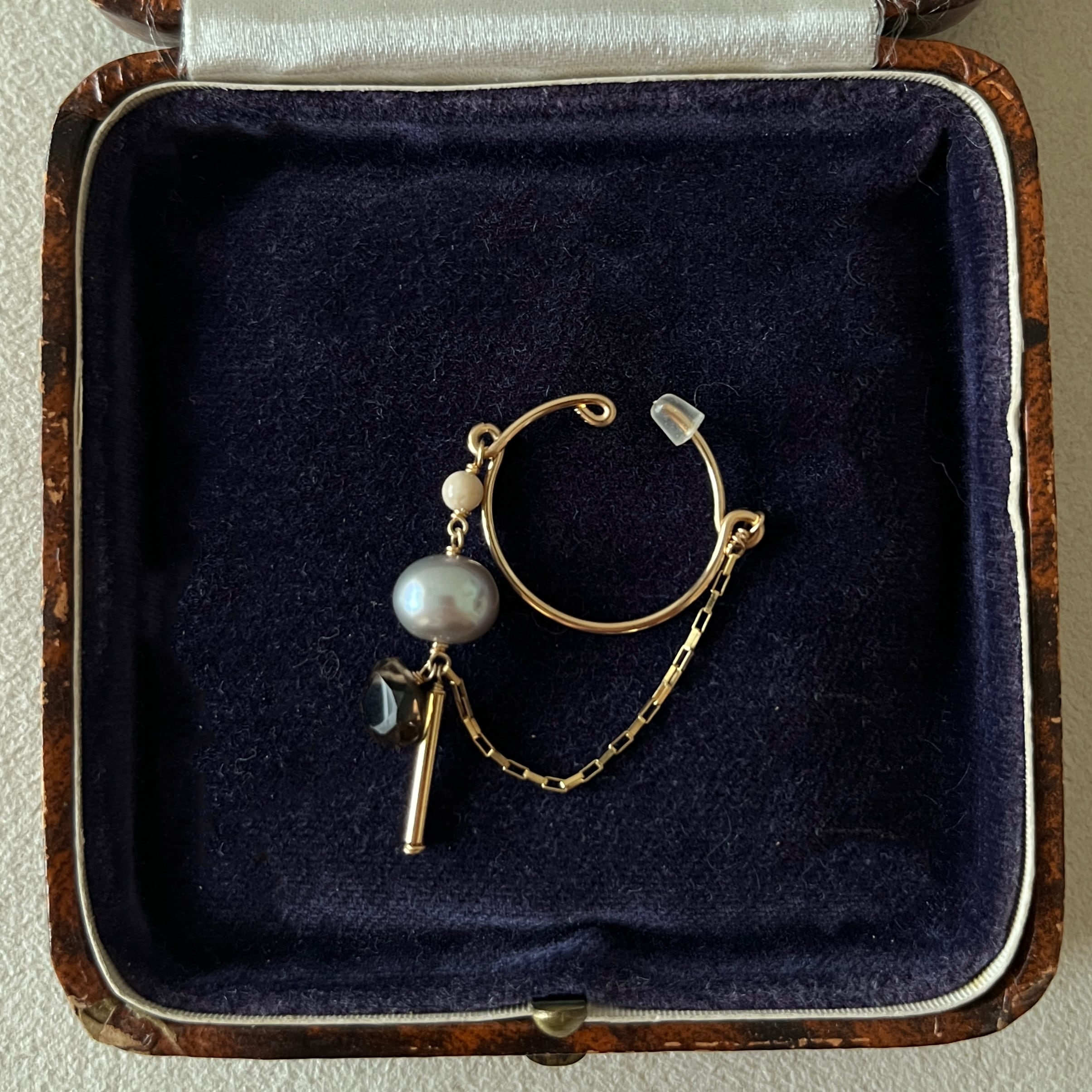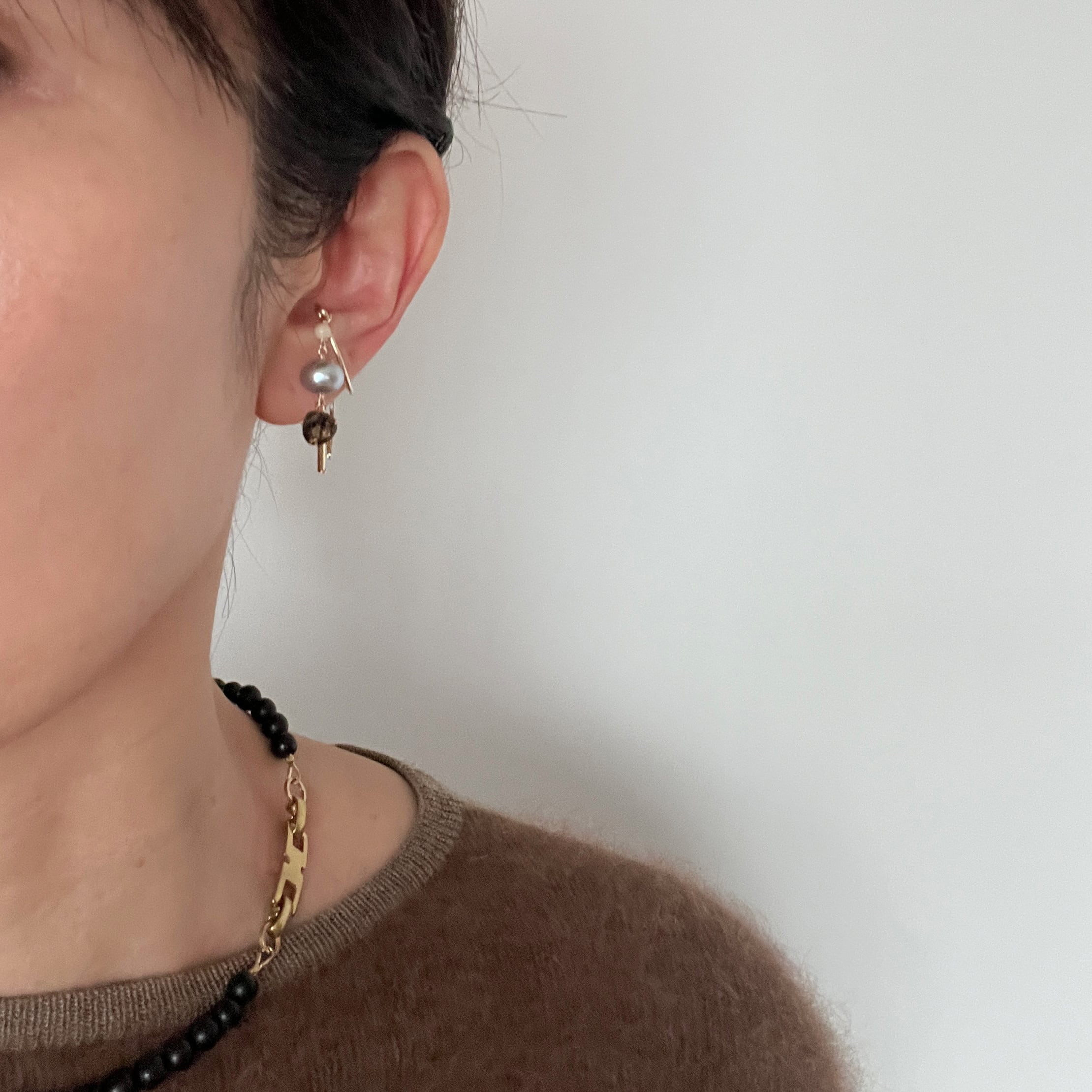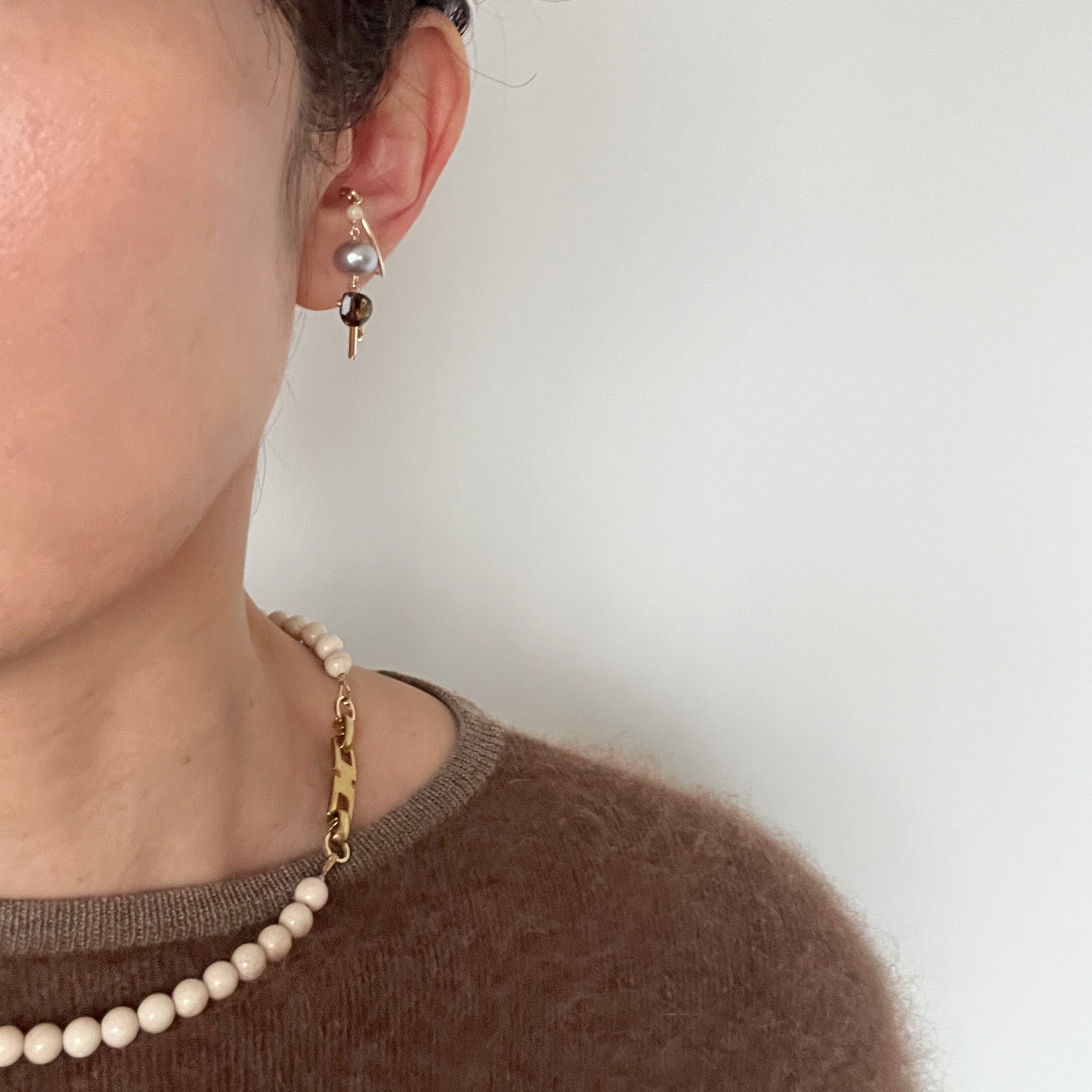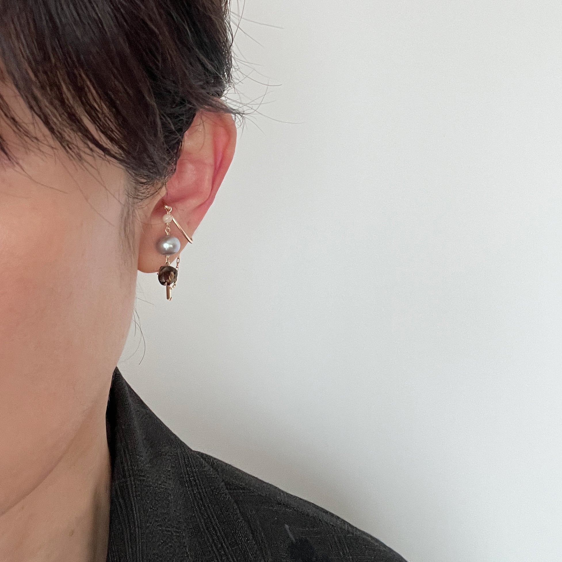淡いグレーパールとスモーキークォーツが絶妙に組み合わさり、可愛らしいコロンとしたデザインが耳元を優しく彩ります。