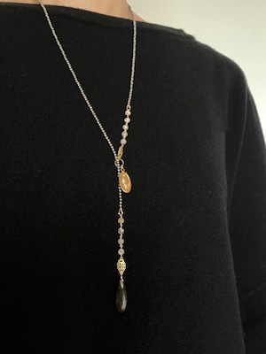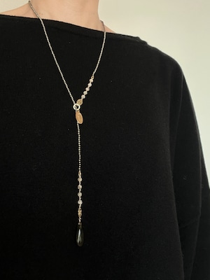ドロップ型のラブラドライトのチャームがポイントになり、カジュアルにも綺麗めスタイルにも合わせやすいデザインです。