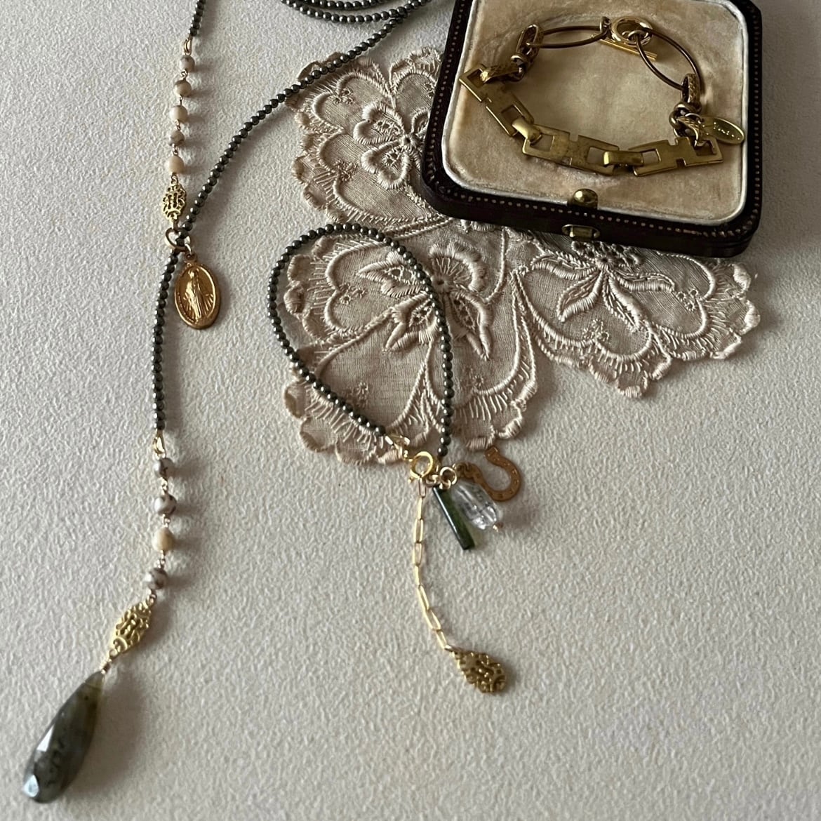 パイライトを使用したラリエットタイプのネックレス。