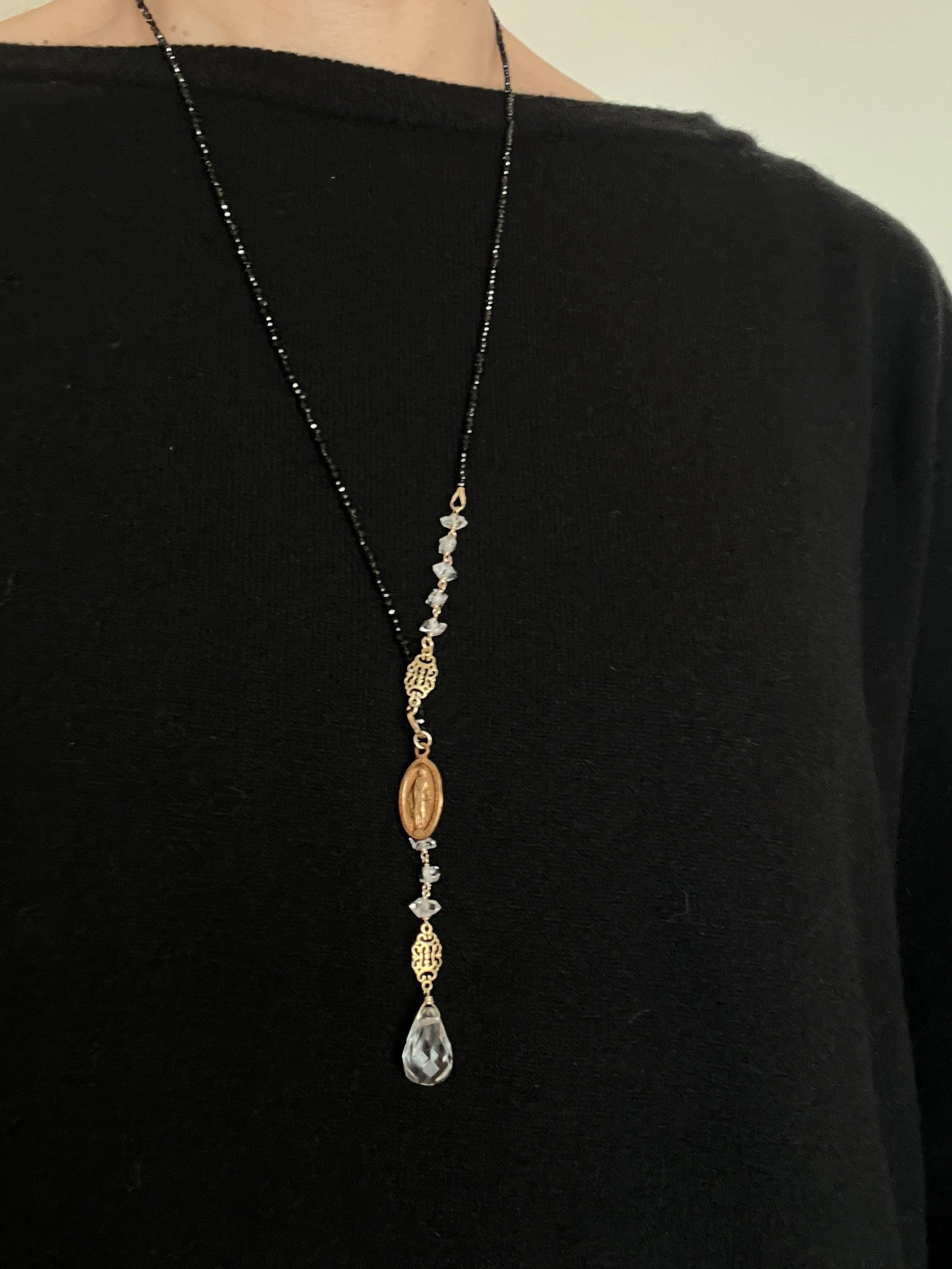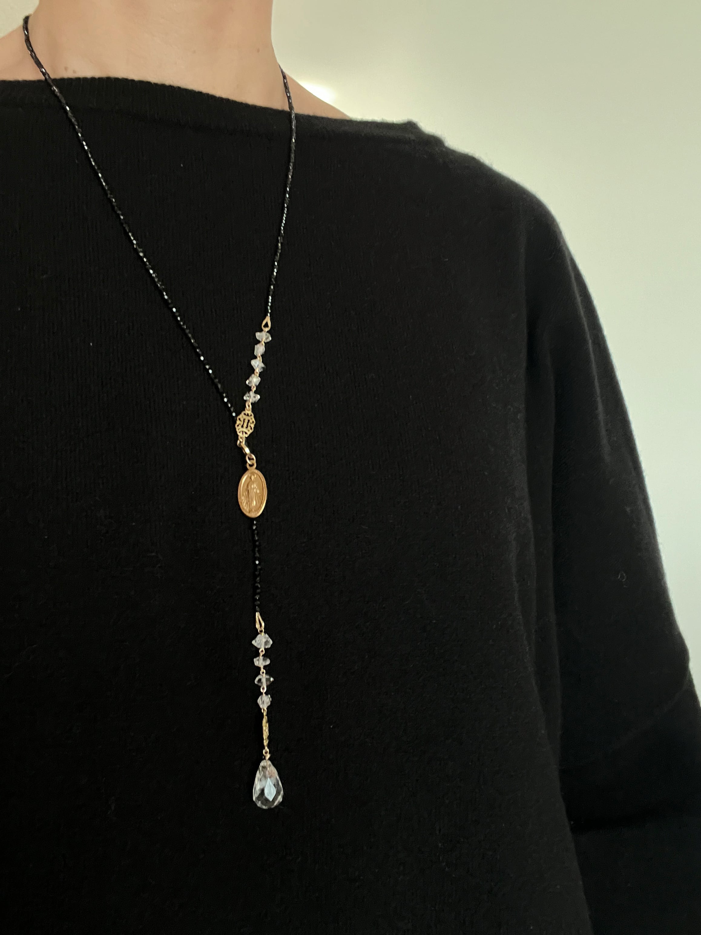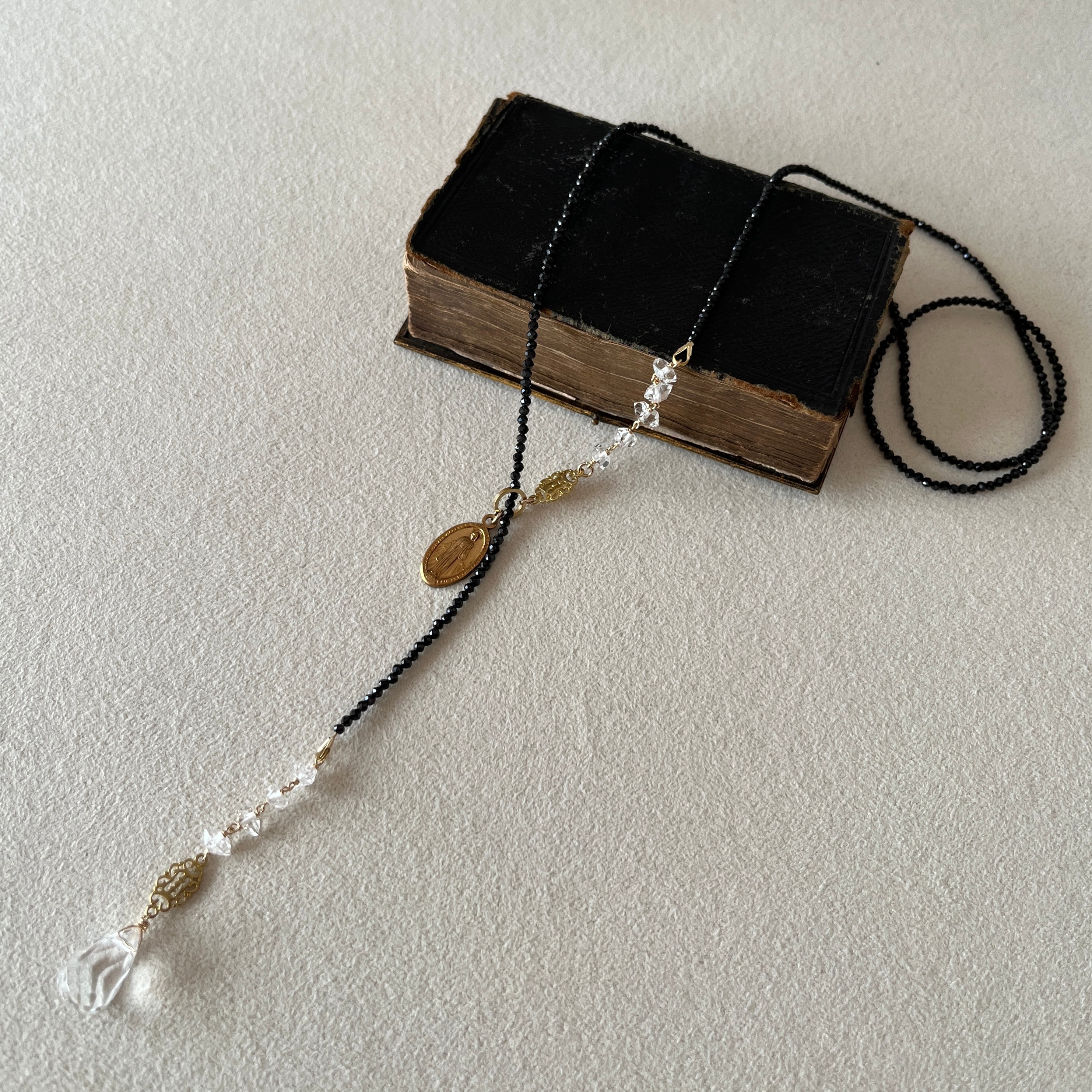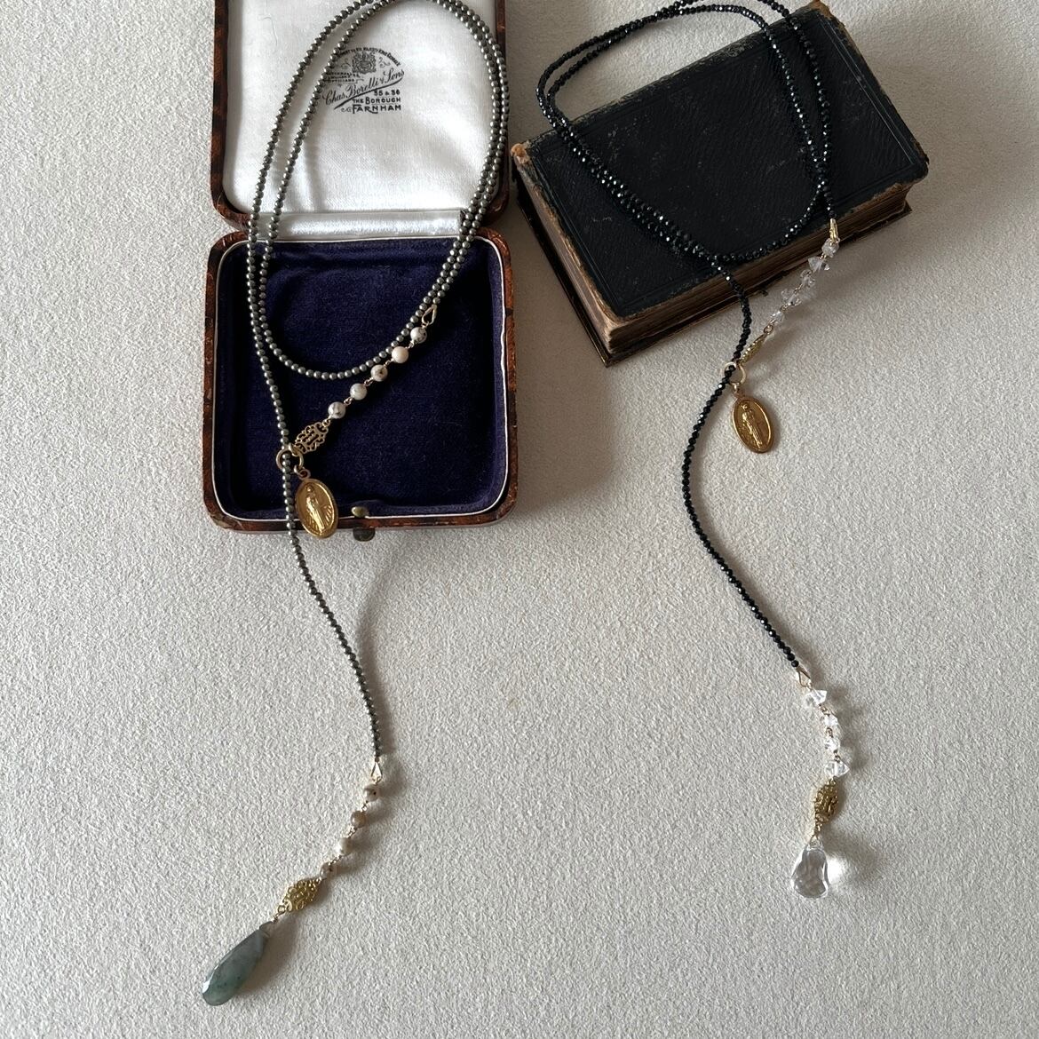 キラキラとしたカットが美しいスピネルを使用したラリエットに透明感のある美しいクォーツを合わせました。