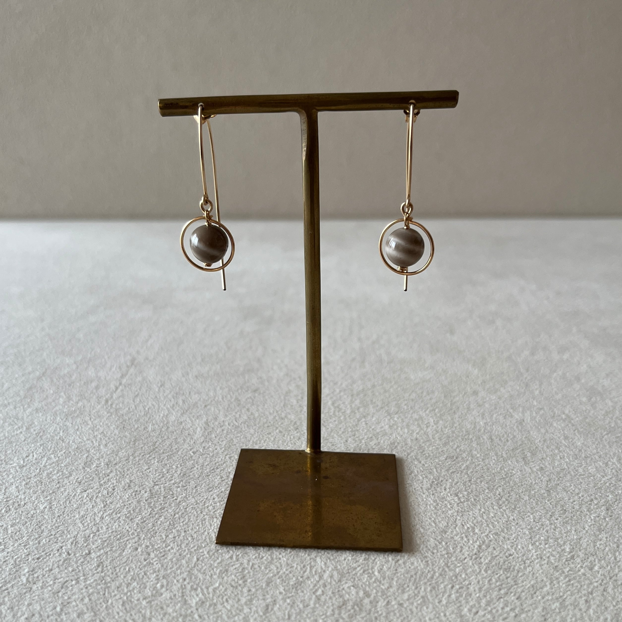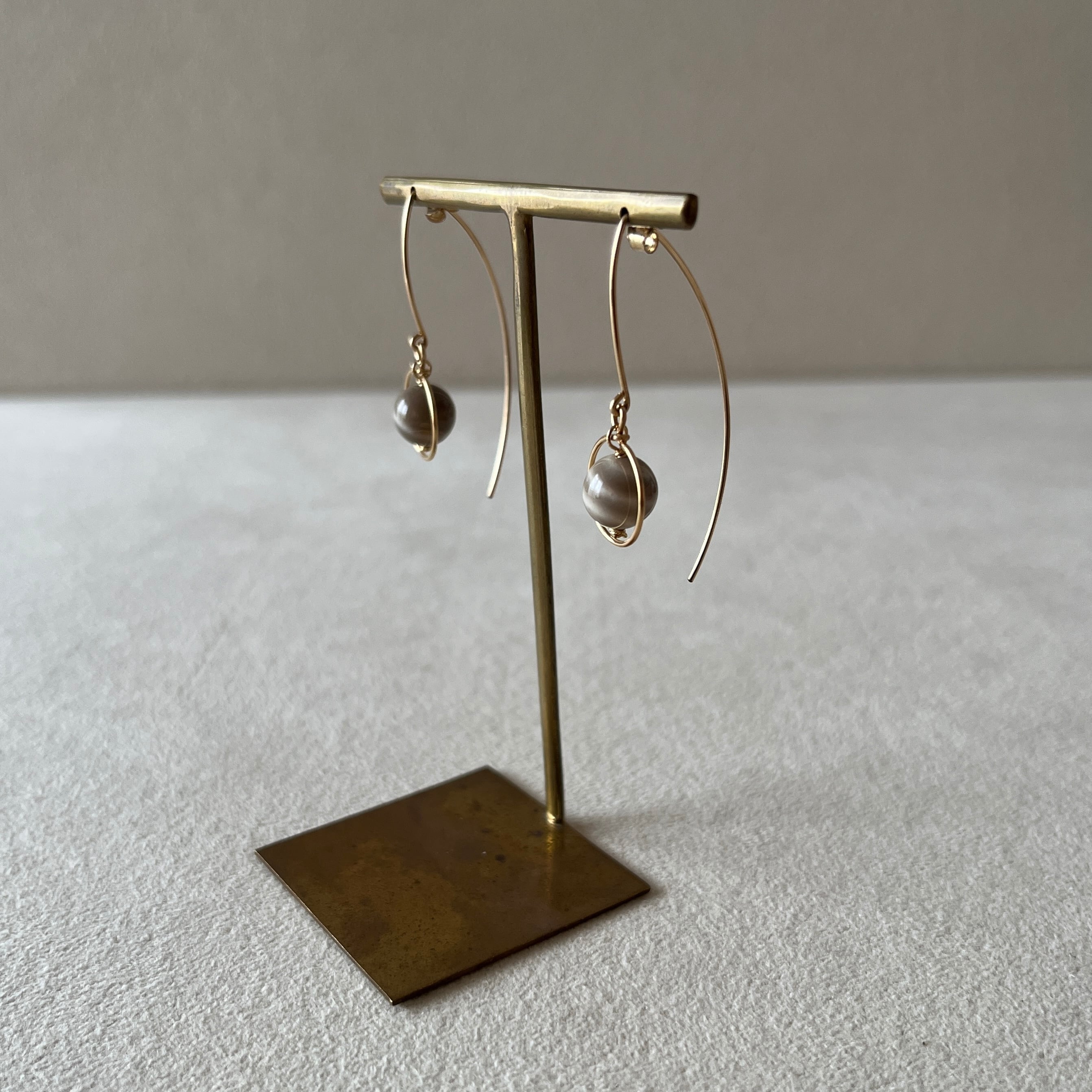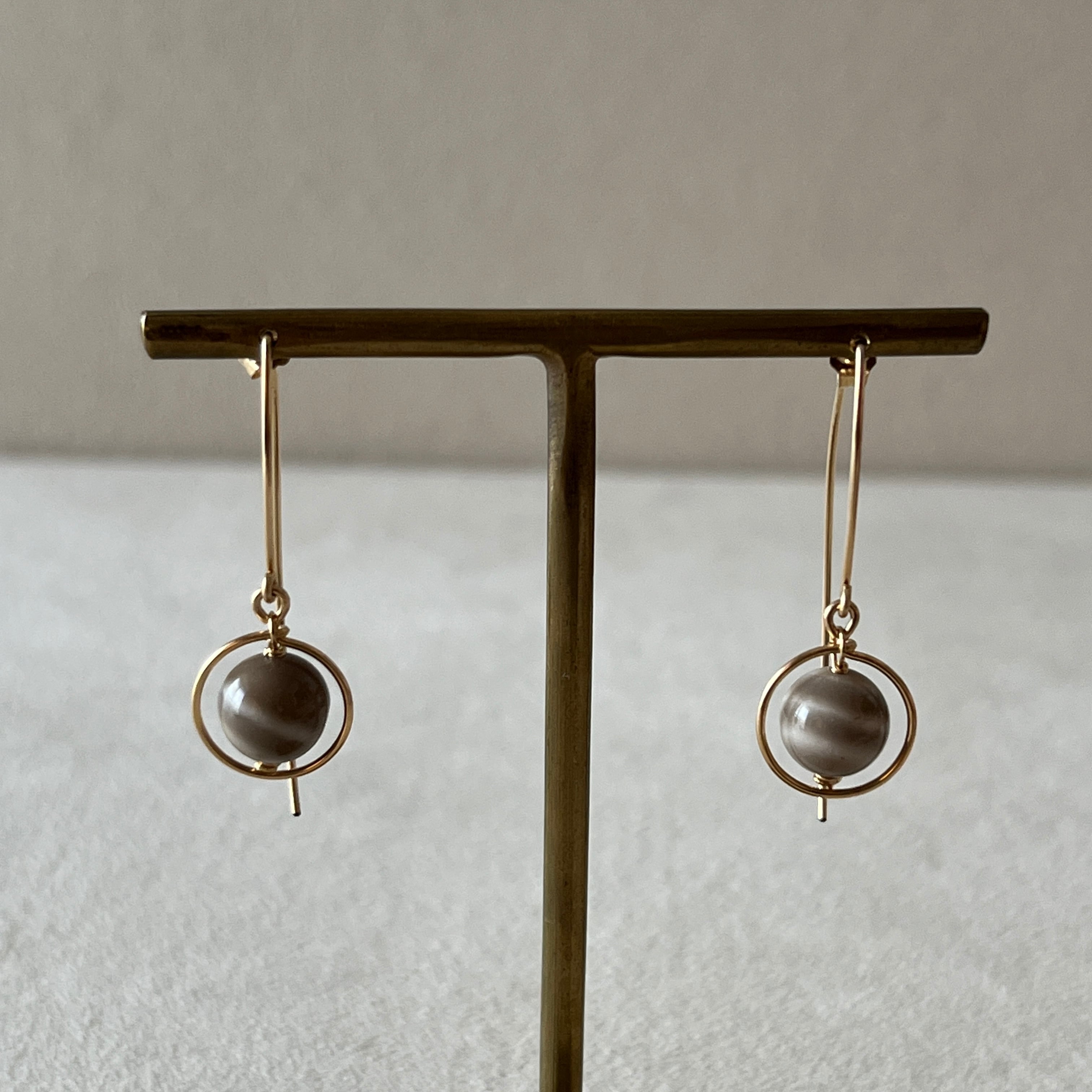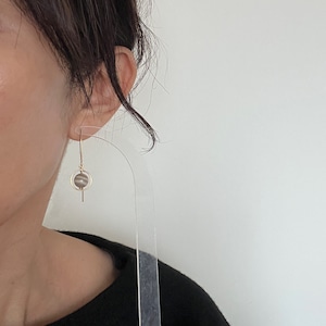 シャープなフックピアスに揺れるチャームが個性的なデザイン。