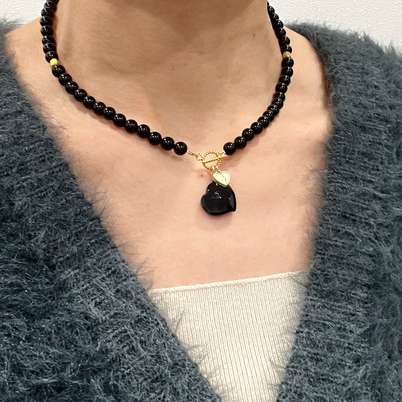 ハードになりがちなオニキスネックレスですが、ハート型のチャームを付けることで可愛らしいエッセンスも加えてみました。