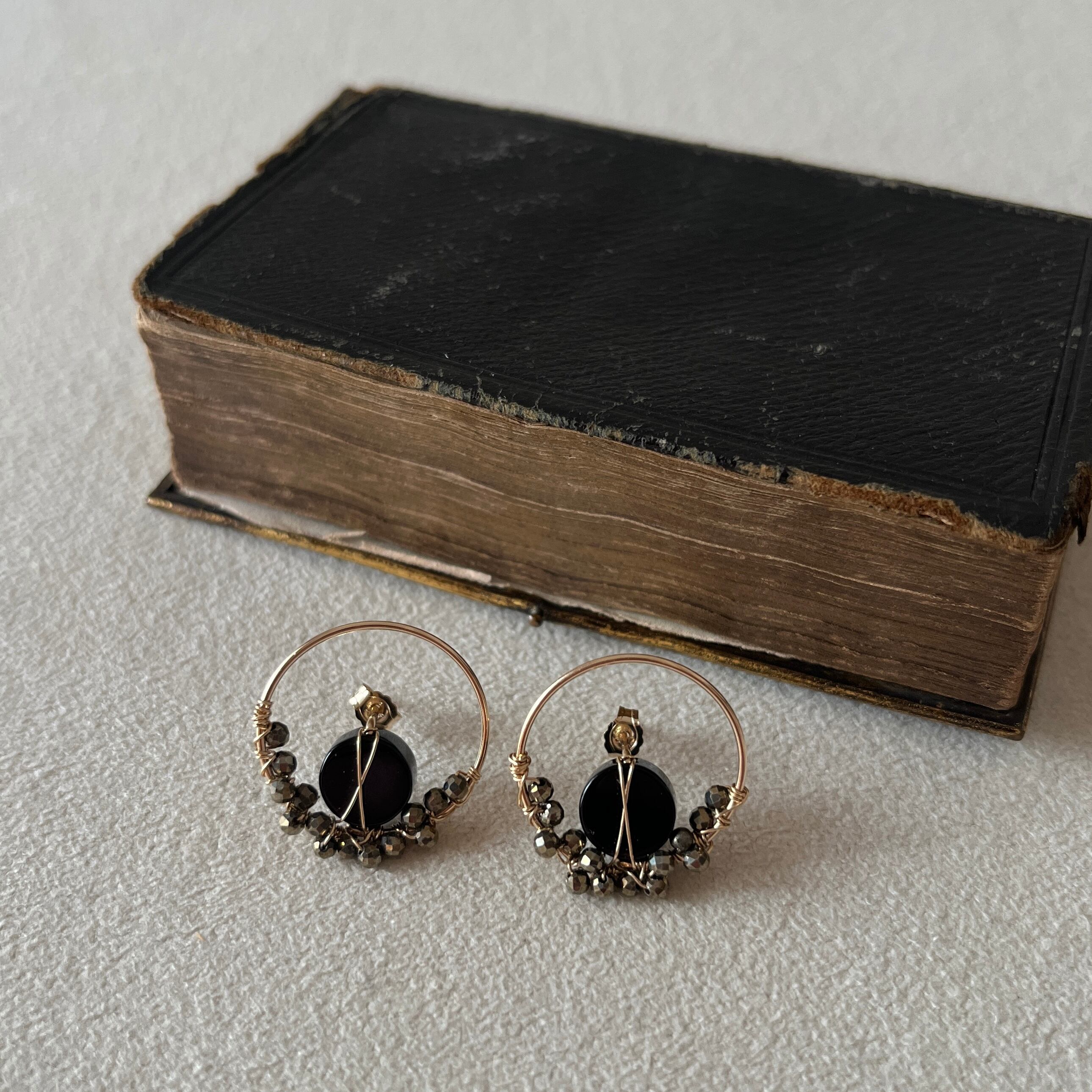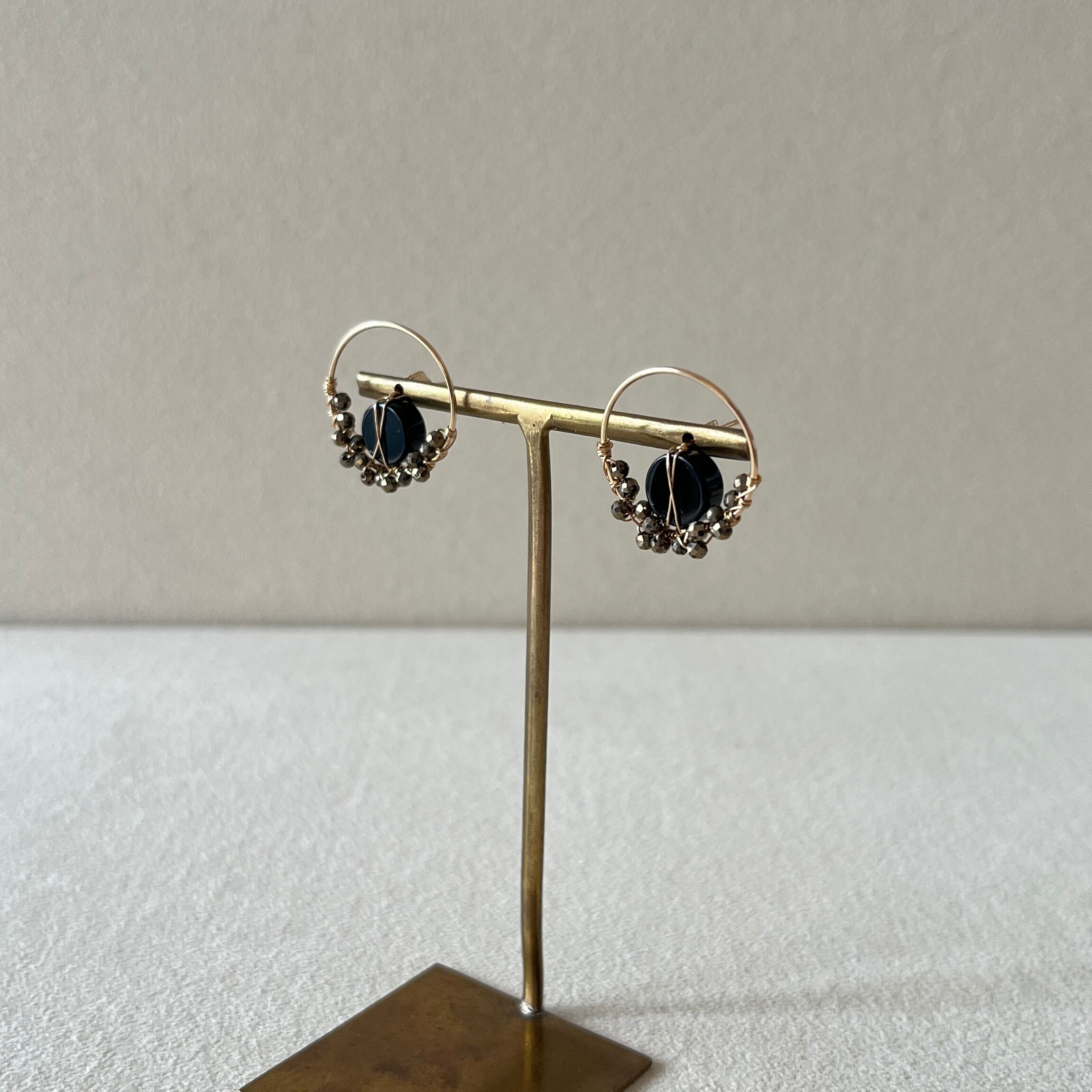 カットの美しいパイライトを沢山巻きつけてシックでありながらも華やかなピアスに仕立てました。