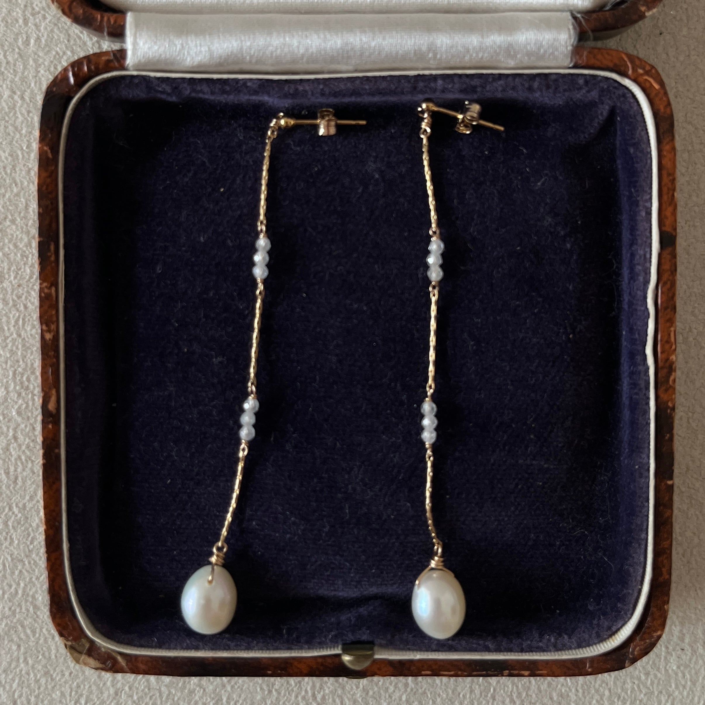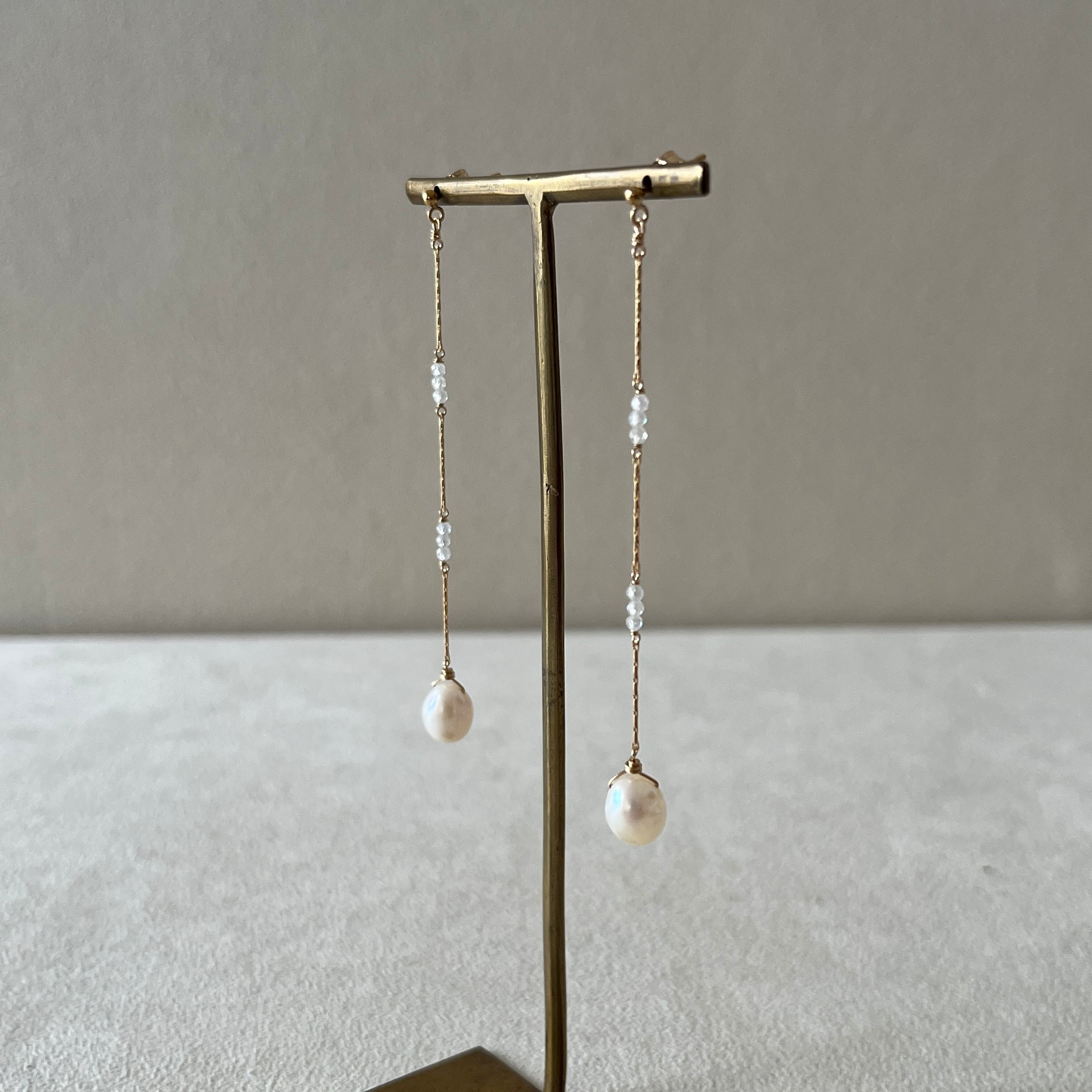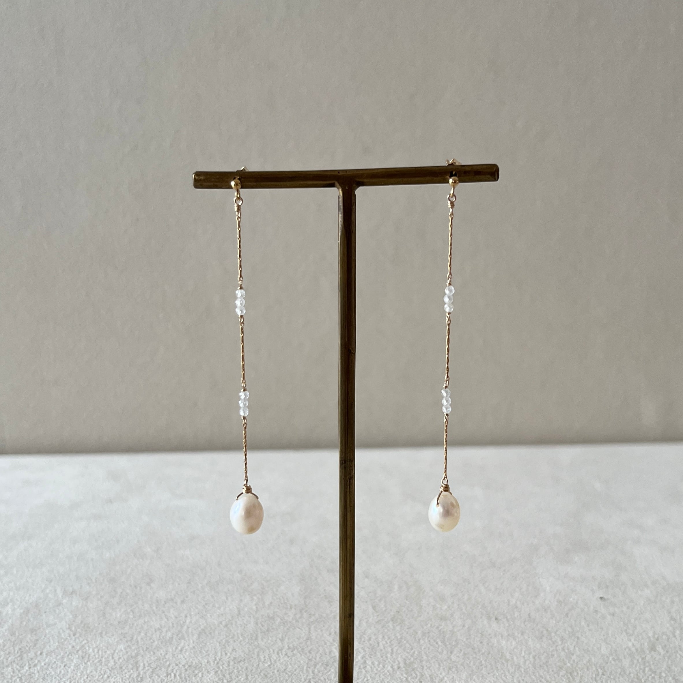 カットの美しい小さなジルコンを間に繋いで華奢なIラインのピアスに仕立てました。