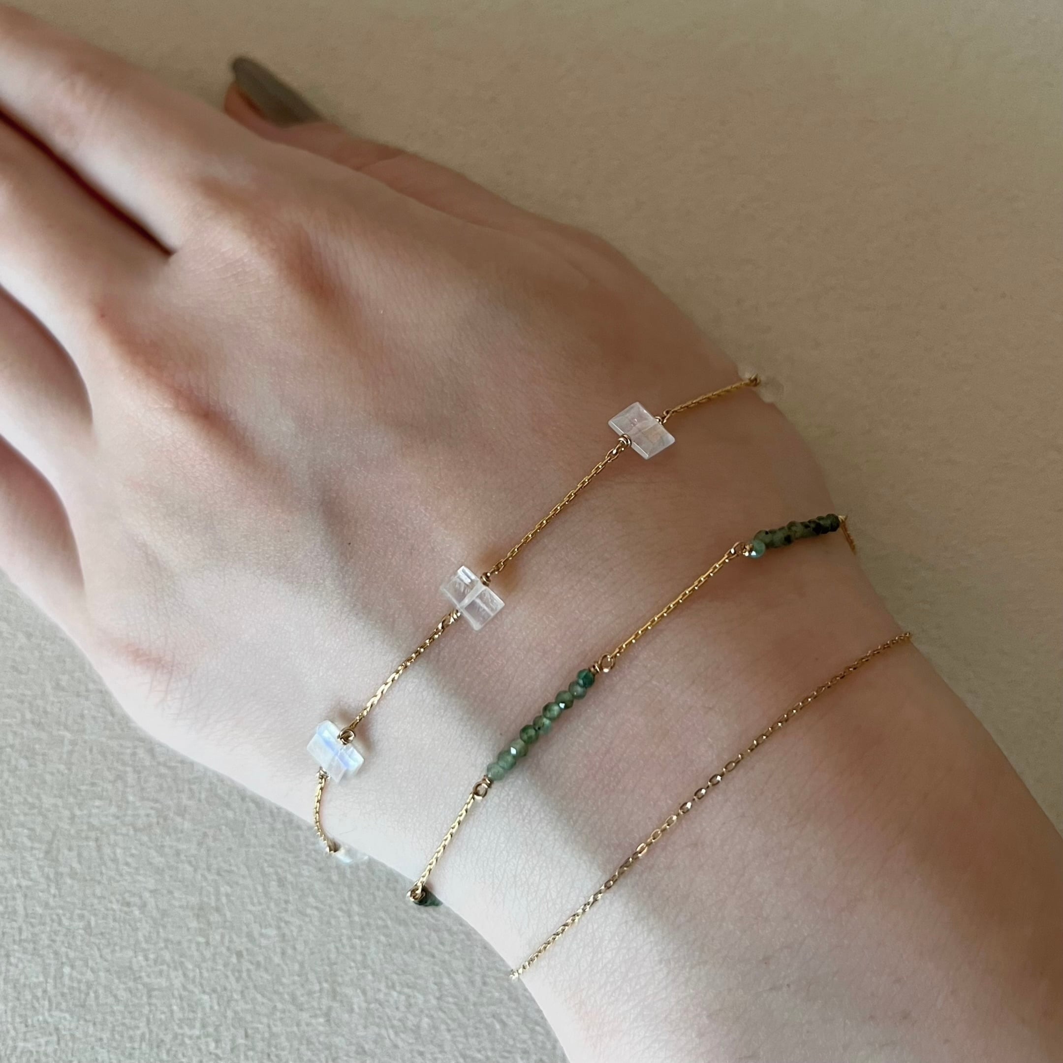グラデーションカラーの小さなエメラルドを繋げたステーションブレスレット